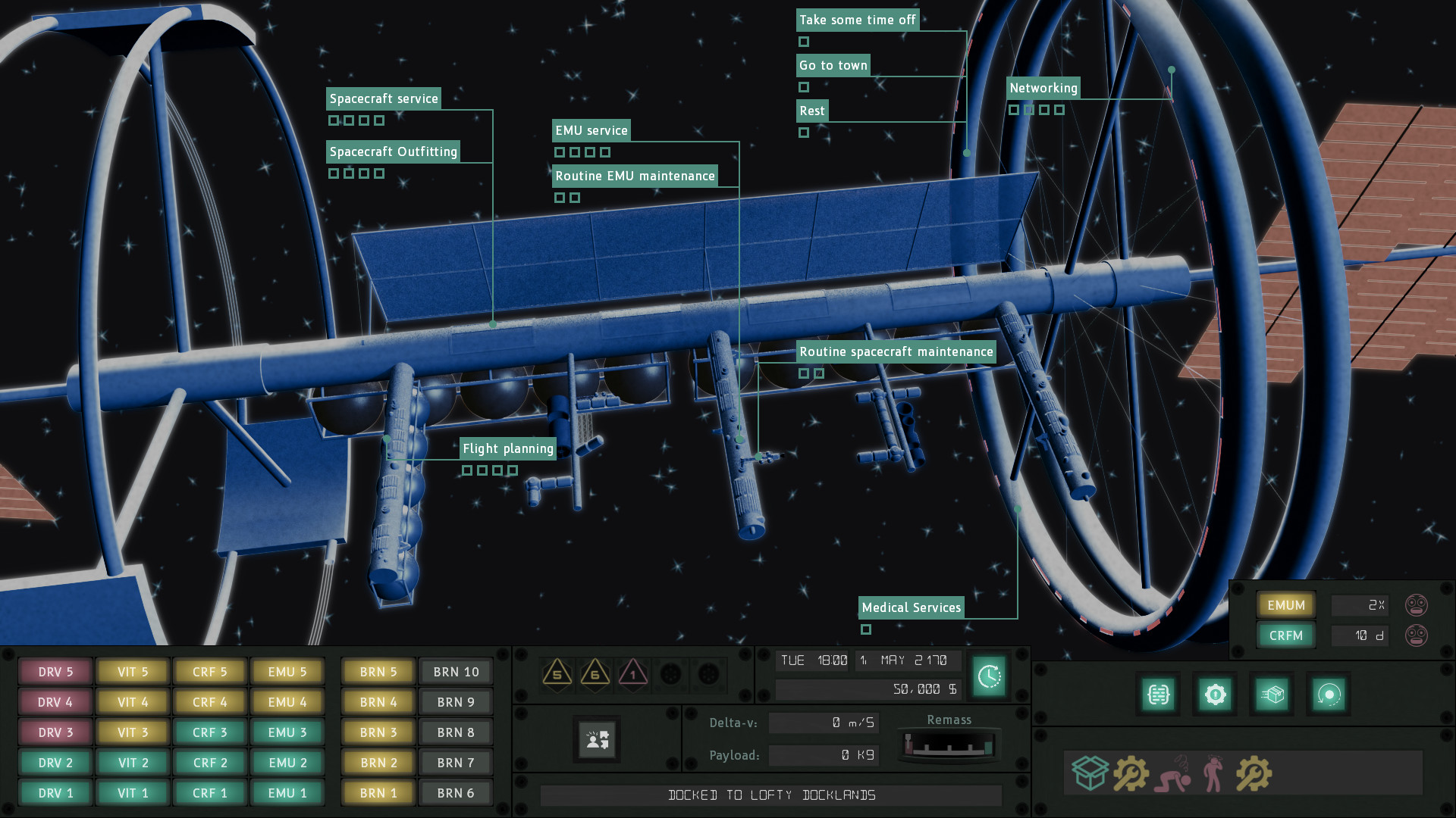As to your suggestions, most of them are in fact somewhere in the backlog. UI-animations like change highlights etc. are planned in the complete UI overhaul that I hope to get done somewhen until July. Loans are an absolute must-have feature in my opinion, as they are the thing that ultimately makes time a limited resource. But before I add that I first need more precise planning, which means I need to stop faking orbital mechanics and actually doing them, which will take some time.