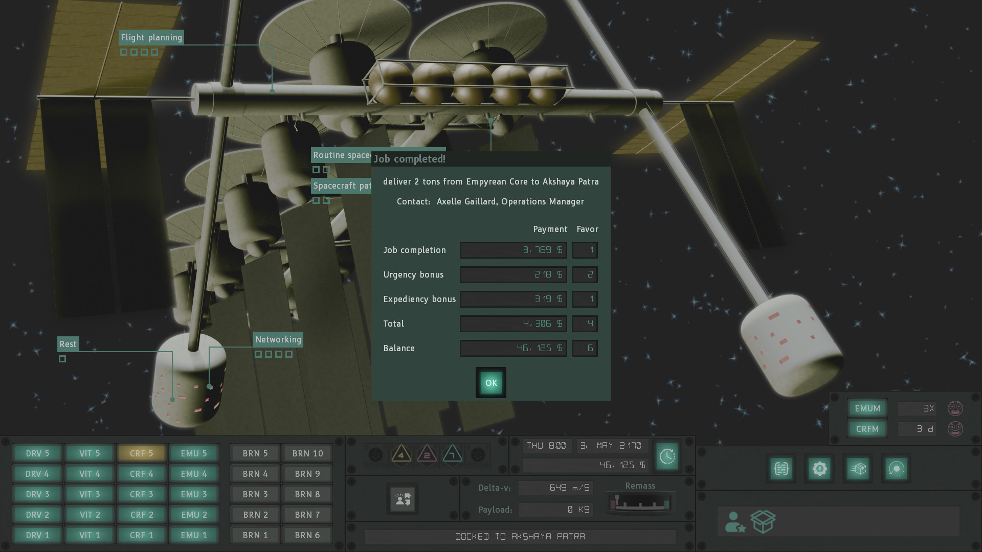 What is currently there is an still early alpha, which I need your feedback on to decide in what direction to take this and how to prioritize all the many things still missing. There is fun and challenge to be had already, though, as you try to get your payloads from station to station or do dangerous EVAs to keep your line from dropping through the bottom, all the while extending your network of business contacts to keep the jobs coming and upgrading your spacecraft to make things a bit easier in the future. And now there's even (some) graphics!